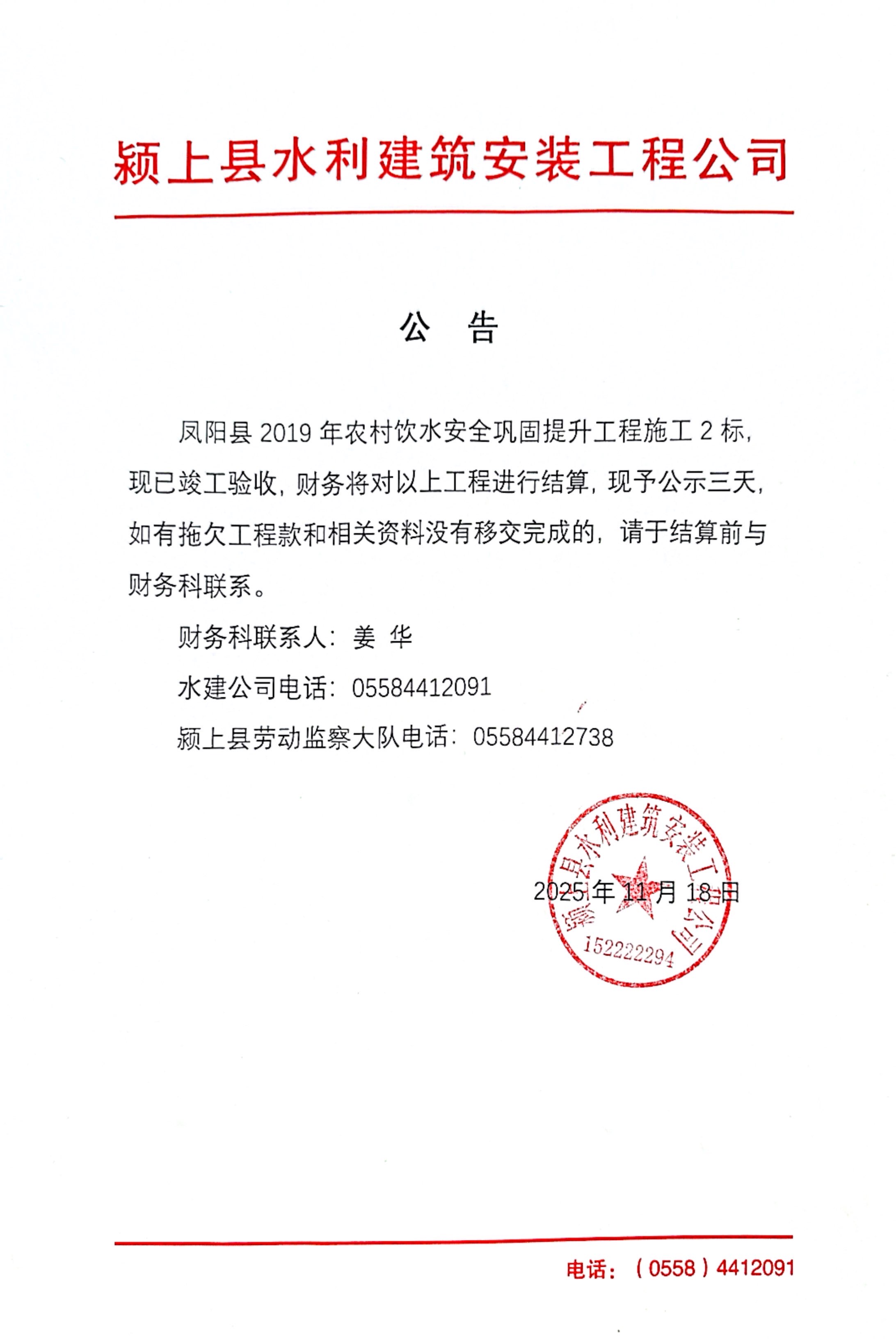 凤阳县2019年农村饮水安全巩固提升工程施工2标